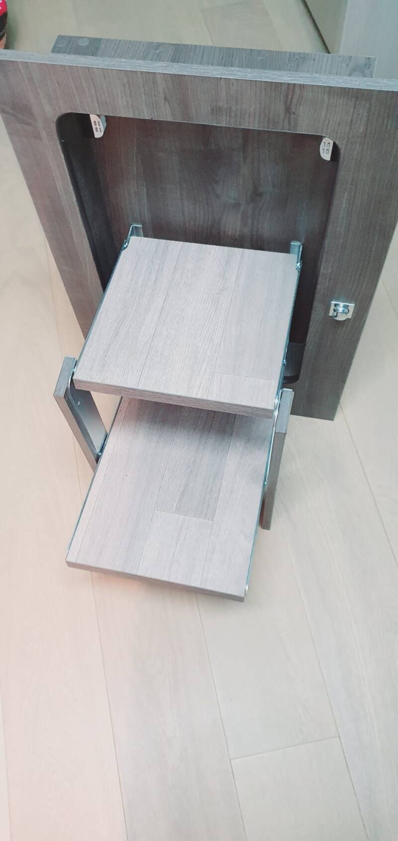 Origineel deurtje met trap ingewerkt dat tussen de garage en slaapgedeelte zit in een Benimar 463.